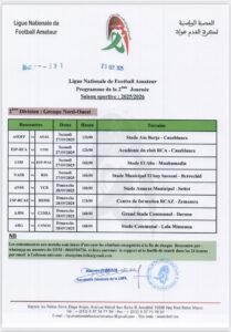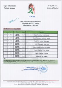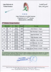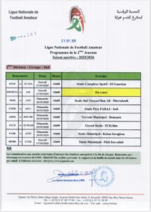 كشفت العصبة الوطنية لكرة القدم هواة ، عن برنامج  الجولة الثانية من مباريات بطولة الهواة  لهذا الاسبوع ، تهم الحولة الثانية من بطولة القسم ا الاول هواة شطر الشمال والجنوب ، والقسم الوطني الثاني هواة شطر الشمال الشرقي والشمال الغربي والجنوب  والصحراء، والجولة الأولى من بطولة القسم الوطني هواة ، وستجرى مباريات هذه الجولة ايام السبت والأحد 27-28 شتنبر 2025
