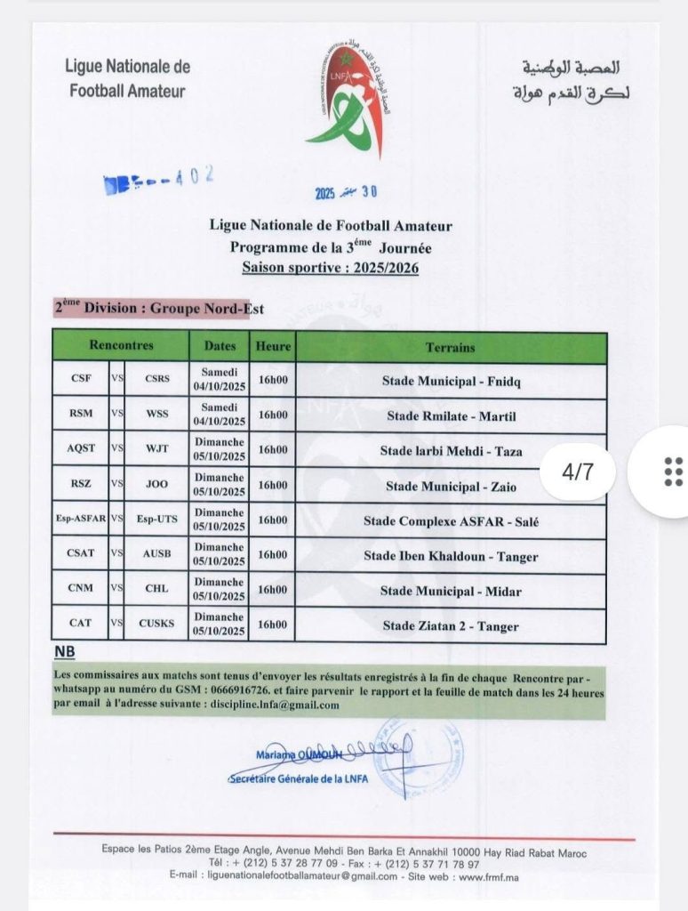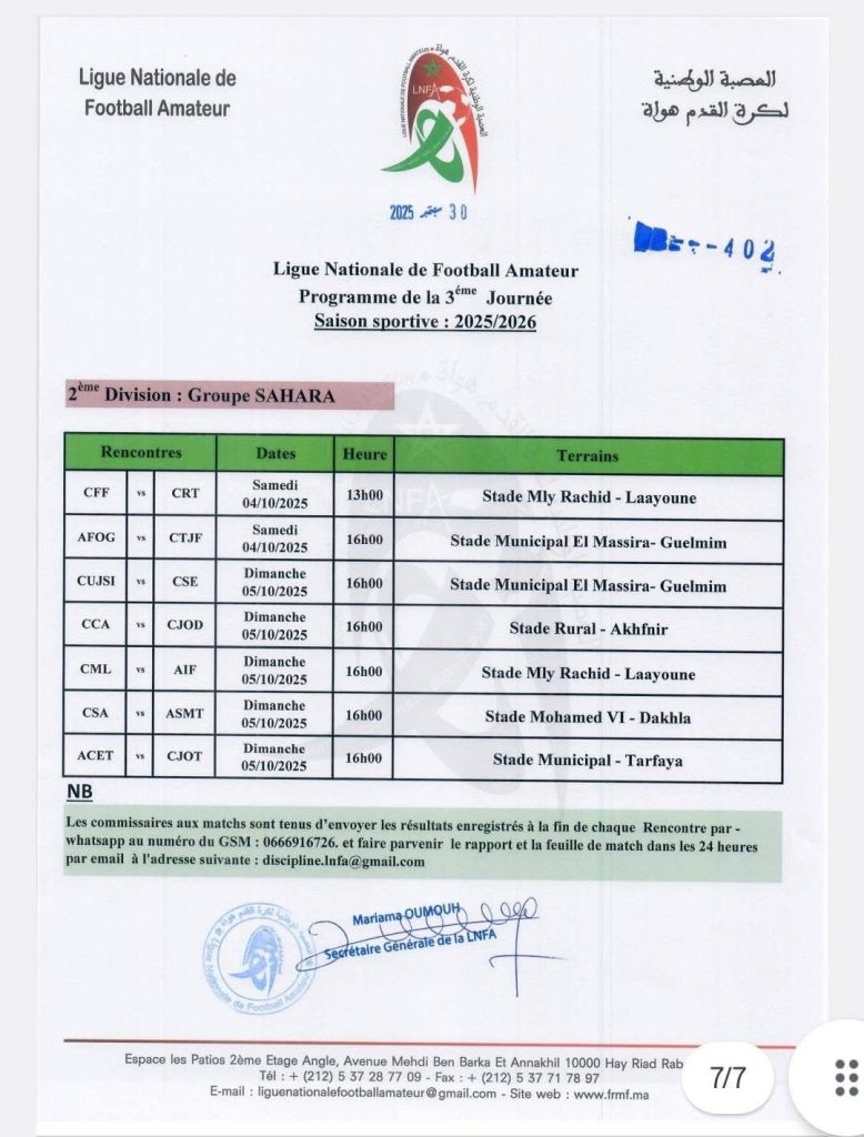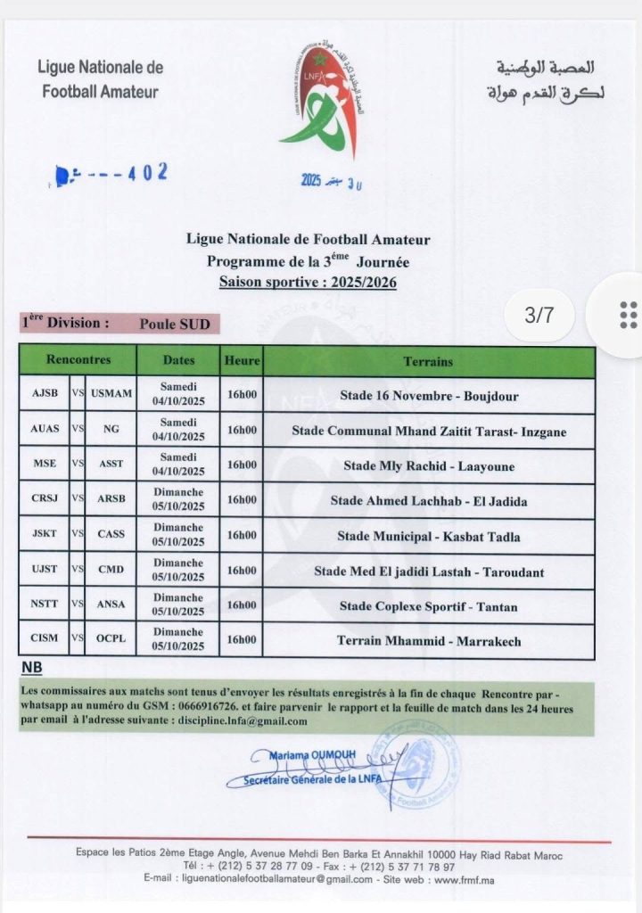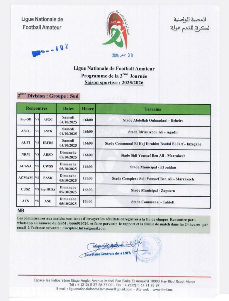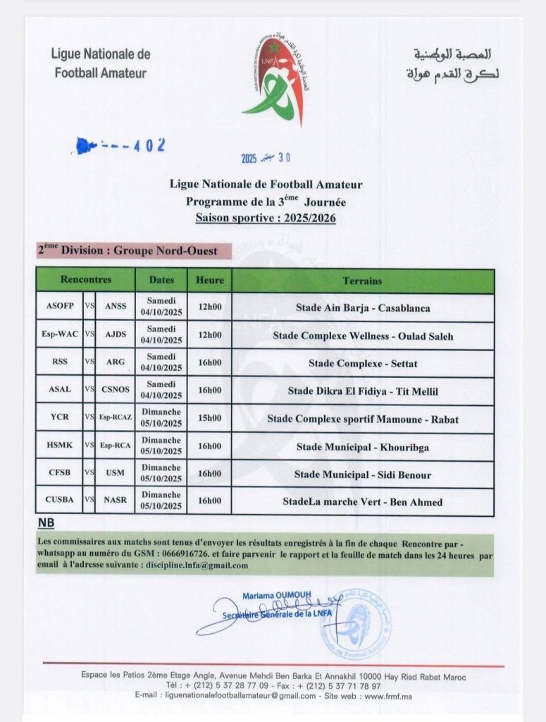 كشفت العصبة الوطنية لكرة القدم هواة ، عن برنامج الجولة الثالثة من مباريات بطولة الهواة لهذا الاسبوع ، تهم الحولة الثالثة من بطولة القسم ا الاول هواة شطر الشمال والجنوب ، والقسم الوطني الثاني هواة شطر الشمال الشرقي والشمال الغربي والجنوب والصحراء، والجولة الثانية من بطولة القسم الوطني هواة ، وستجرى مباريات هذه الجولة ايام السبت والأحد 04-05 أكتوبر 2025