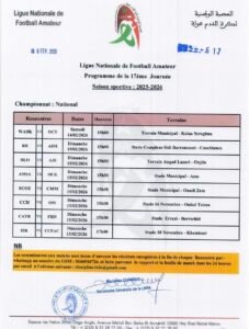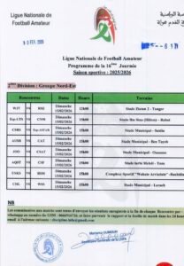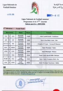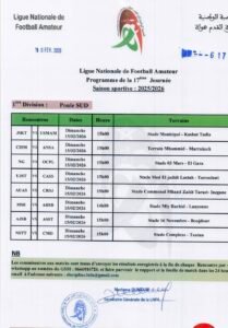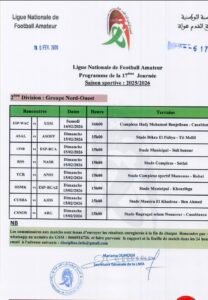 كشفت العصبة الوطنية هواة عن برنامج الجولة 17 من بطولة القسم الوطني هواة، والقسم الأول هواة شطر الشمال والجنوب، والثاني هواة شطر الشمال الشرقي والشمال الغربي والجنوب والجولة 16 شطر الصحراء، وستجرى مباريات هذه الجولة أيام السبت والأحد 15