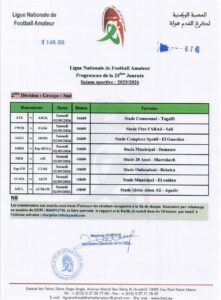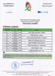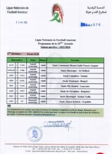 عصبة الهواة تكشف عن برنامج الجولة 25 من البطولة كشفت العصبة الوطنية هواة عن برنامج الجولة 25 من بطولة القسم الوطني هواة، والقسم الأول هواة شطر الشمال والجنوب، والثاني هواة شطر الشمال الشرقي والشمال الغربي والجنوب والصحراء ، وستجرى مباريات هذه الجولة أيام السبت والأحد , 01 – 02 ماي 2026